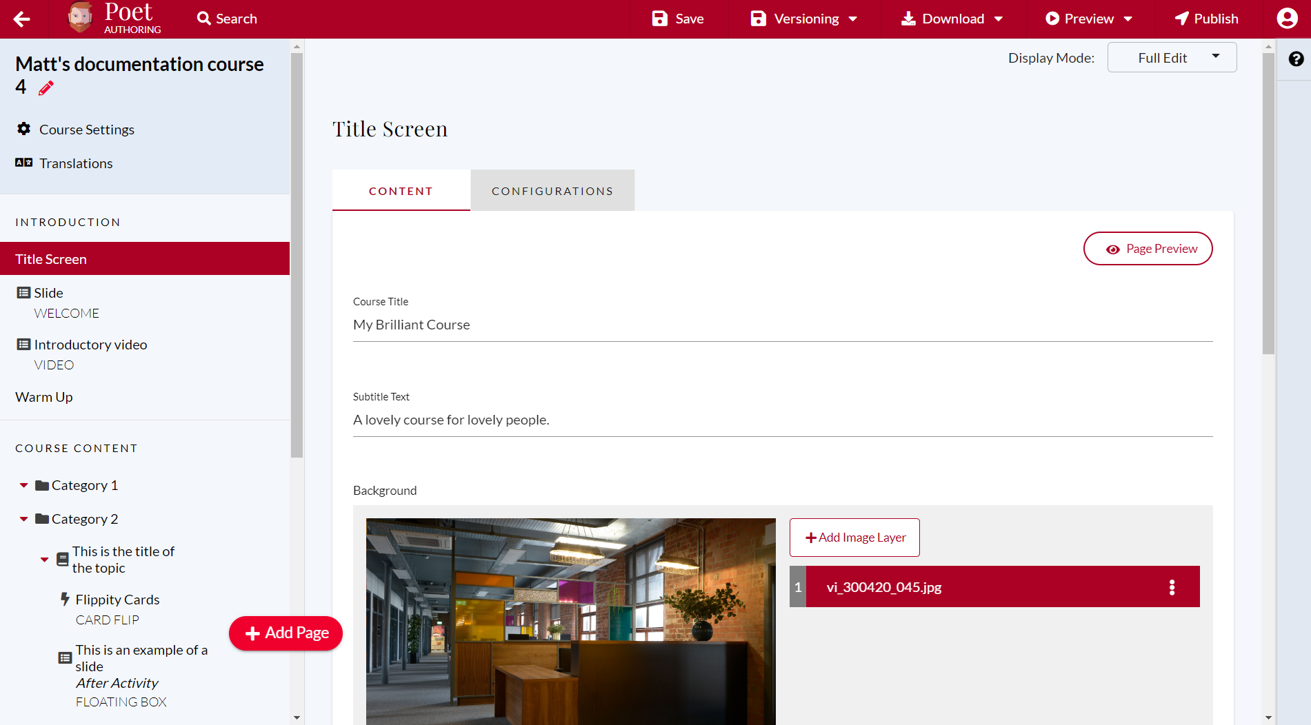 Simple Edit can only make changes to text throughout the course. The editable text is all displayed on a single page and can be edited by clicking the red pencil icon. |