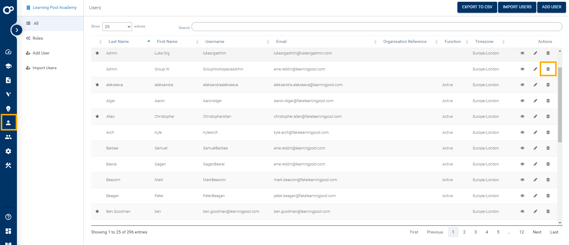 Remember: Deleting a user account in this manner can only be reversed by contacting Learning Pool Support.