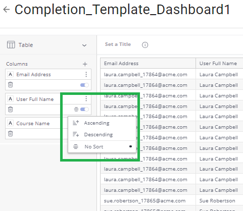 - You can also sort the data. For example, if you want to order by who is enrolled on each course alphabetically you would toggle on sorting on the User name field to ‘Ascending’.