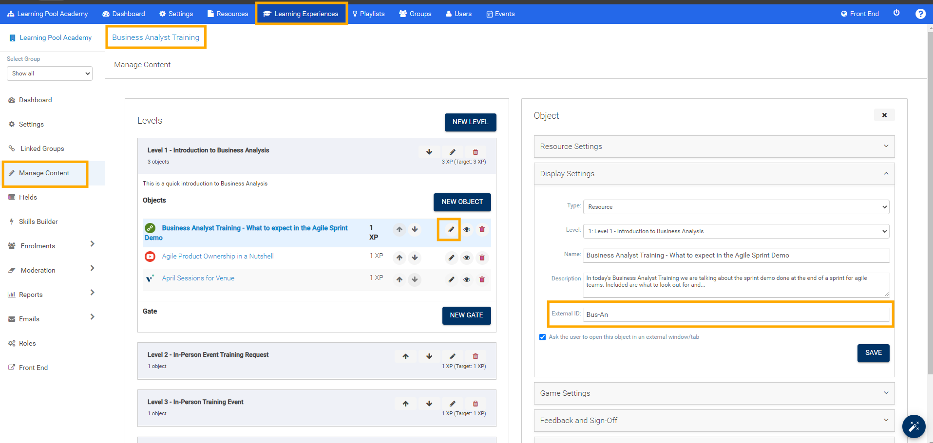 A. The learning object external ID is a unique field that can be added in the settings of the learning experience in the ‘External ID’ setting of each object. The maximum number of characters in this field is 225.