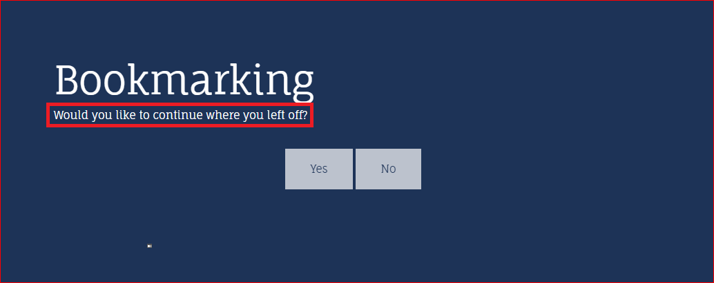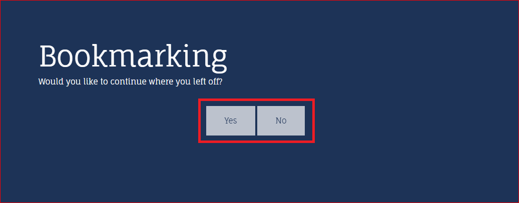 - Enabled - If the prompt is enabled the learner will be provided a prompt as to ask if they wish to return to their previous place within the course. The learner will have the ability to dismiss this prompt to access the menu page.