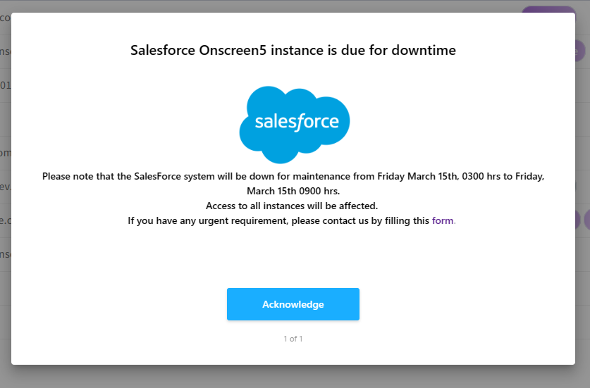 An Author can create announcements for their end users using a simple OnScreen Guidance Wizard. The content can include URLs, images, or even guide links to make them more effective. The announcement can be tied to a specific page or set of pages so that they appear to select users in the right context at the right time.