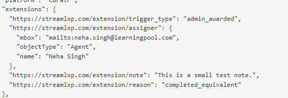 When Learning Experience is marked completed and the changes are saved, 'Completed' xAPI statement is generated with trigger_type as 'admin_awarded', admin details, and 'completion reason' and 'note' in the extension.