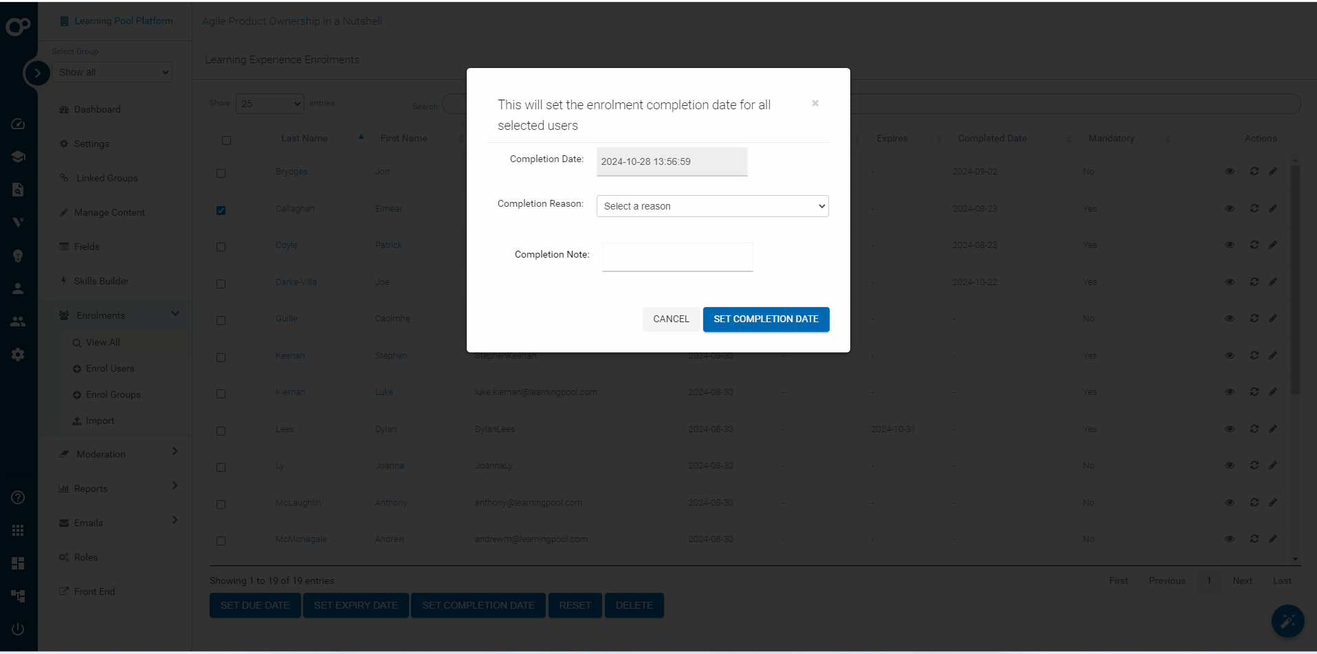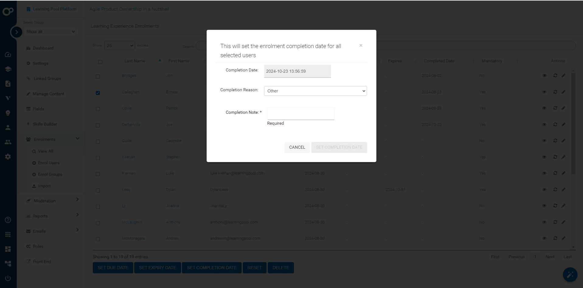 Click on the 'Set Completion Date' button at the bottom of the table. A model titled "This will set the enrollment completion date for all selected users" will appear.
