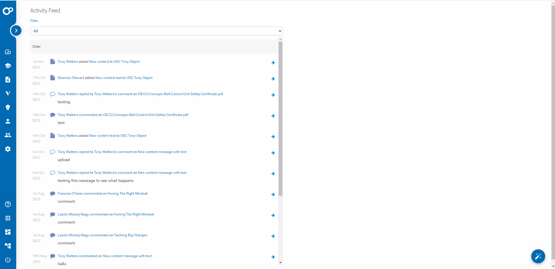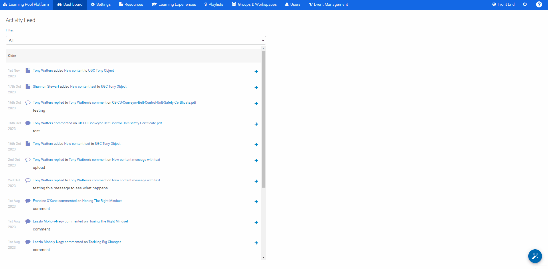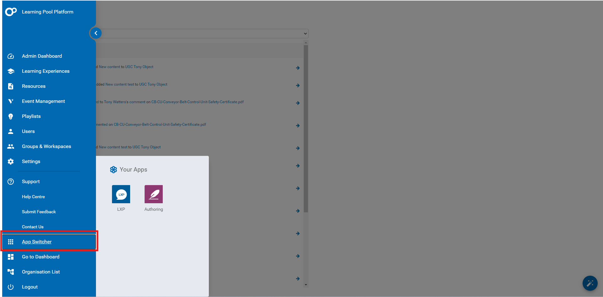 - Each item in the vertical navigation bar links directly to an admin page. Users can click on these to access different sections, such as the Admin Dashboard (Activity Feed), Learning Experiences, Playlists, and Groups & Workspaces.