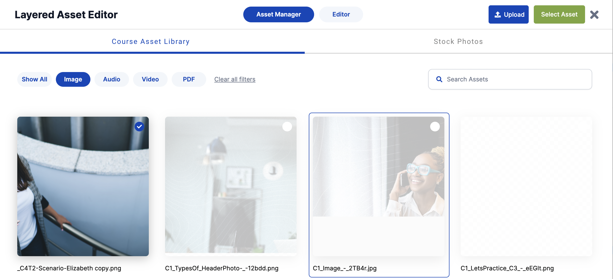 3. After uploading your image from your device it will appear in the Course Asset Library tab. Select your image, then click the "Select Asset" button.