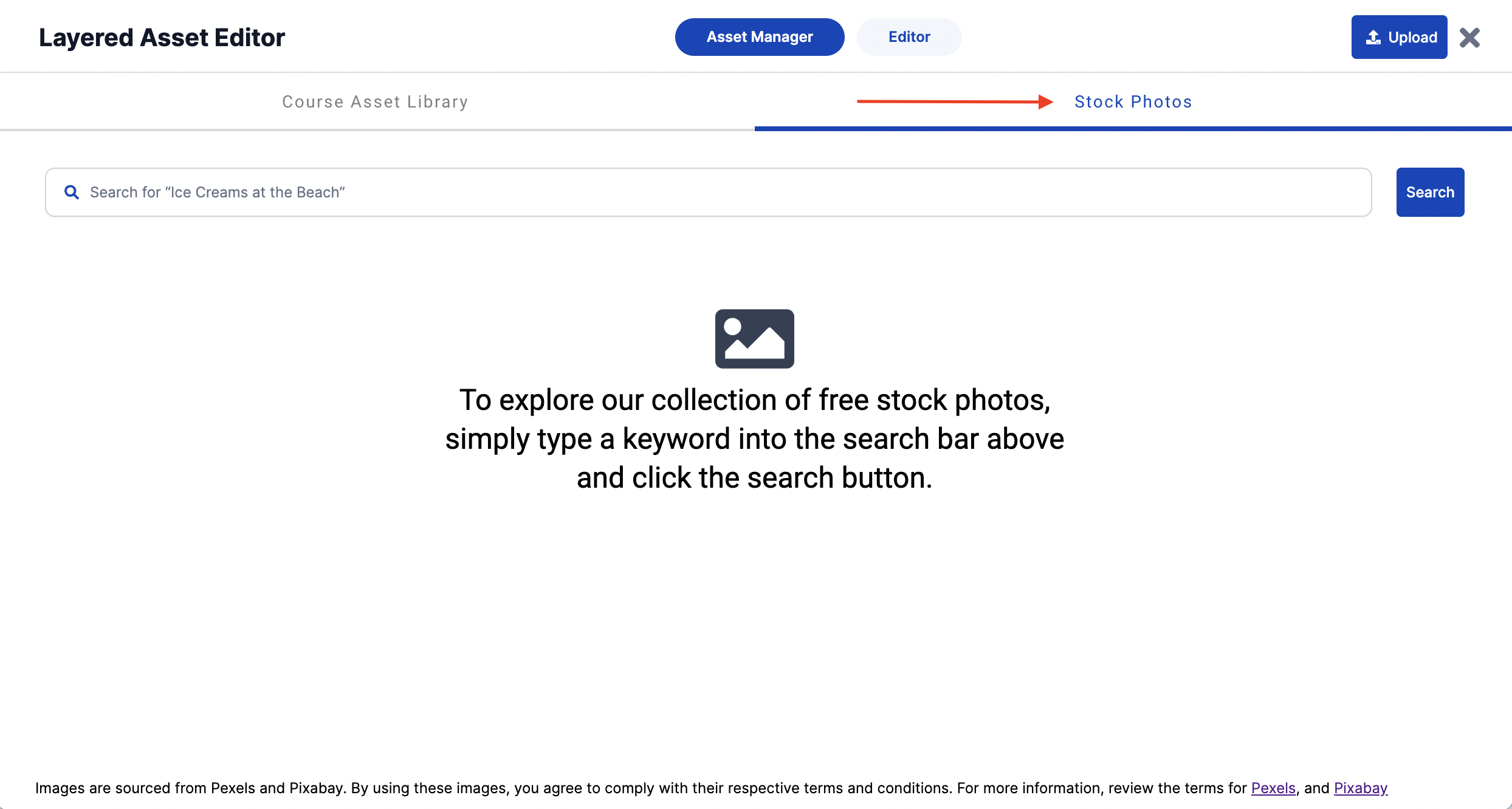The asset manager offers users multiple options for adding images to their course. You can choose from existing assets in your course, search for royalty-free images, or upload your own image directly from your desktop.