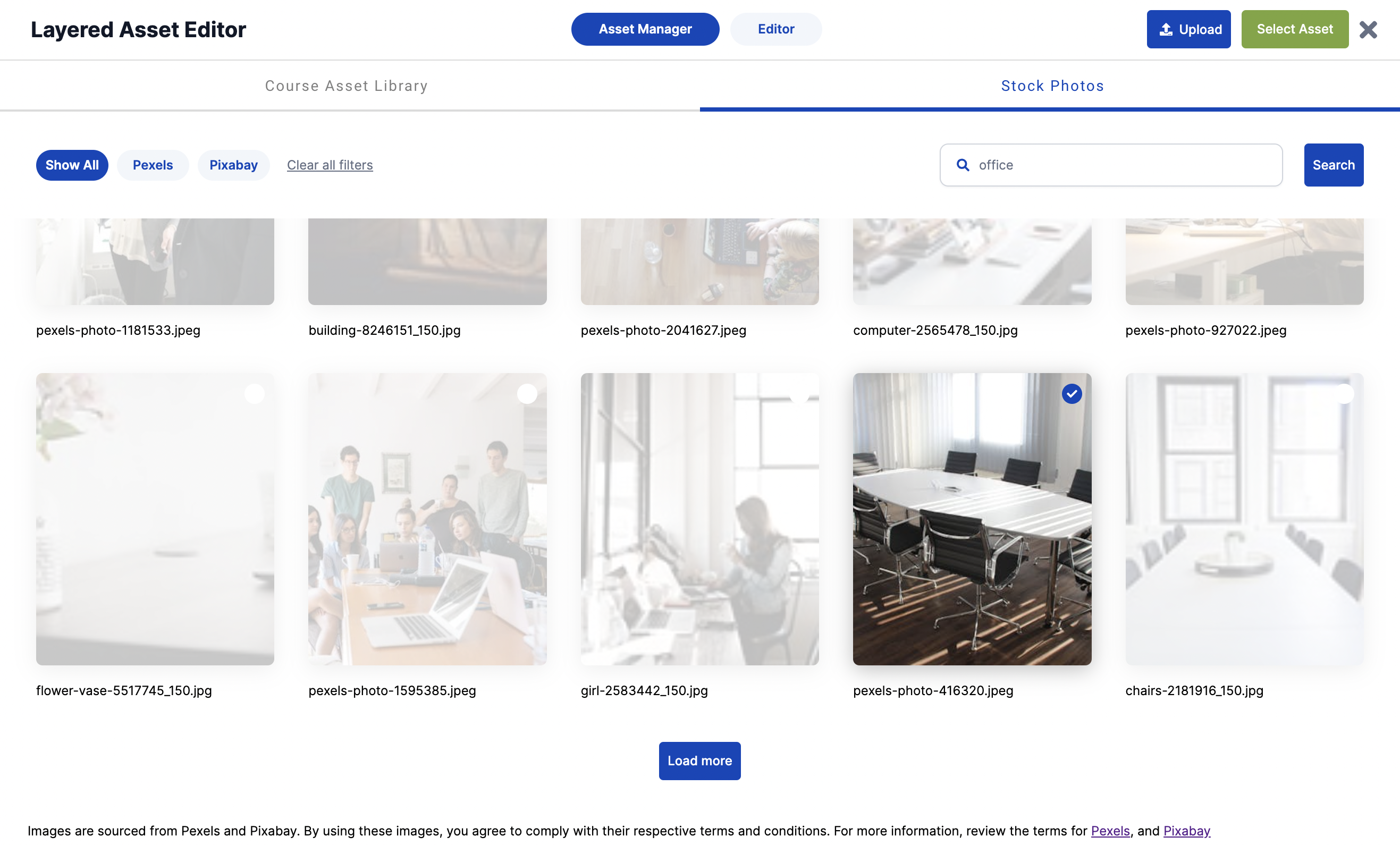 5. Browse the images available and click on any image to select it, then click the "Select Asset" button. Users can click on the "Load More" button at the bottom of the page to load more options.