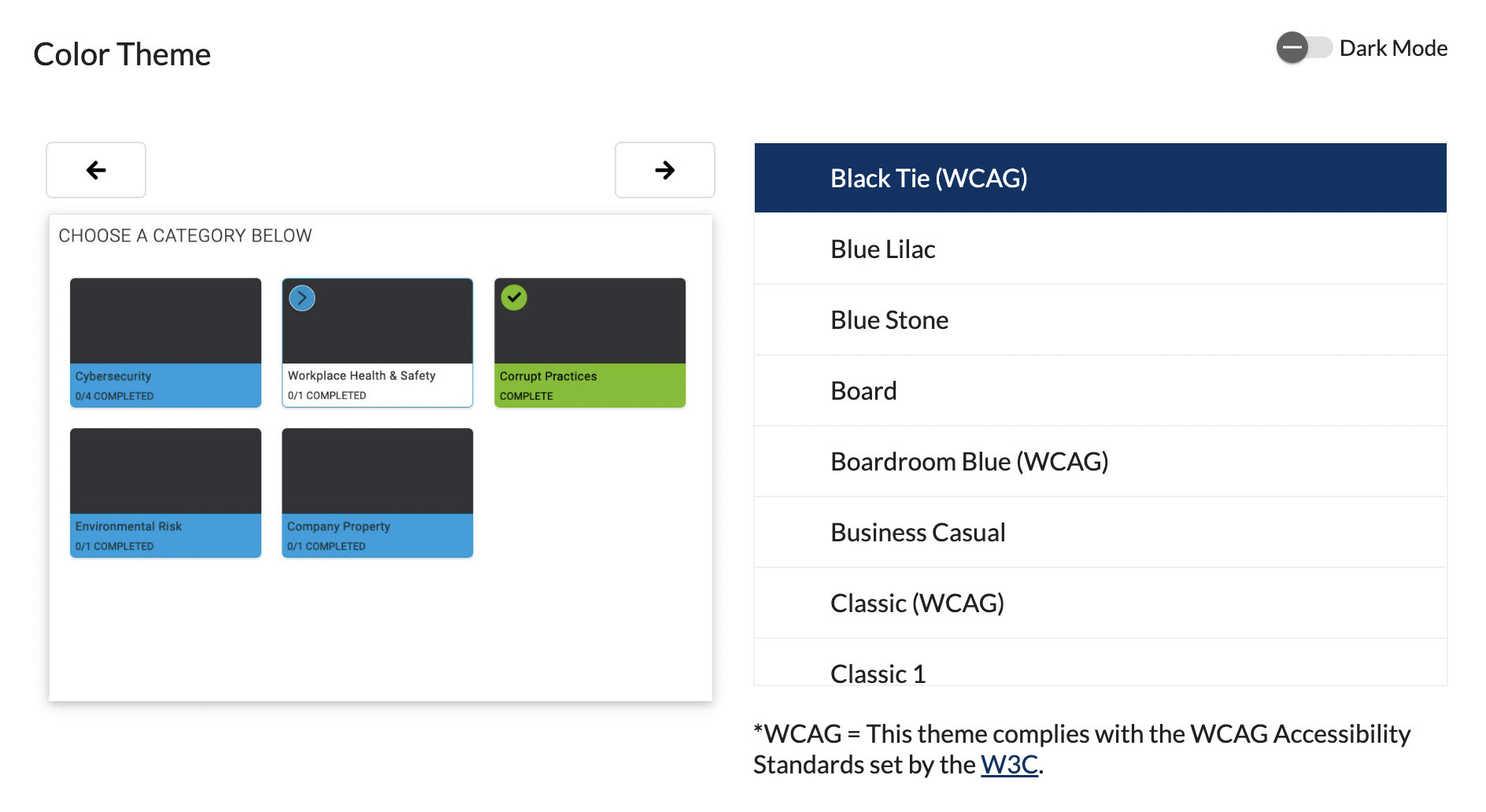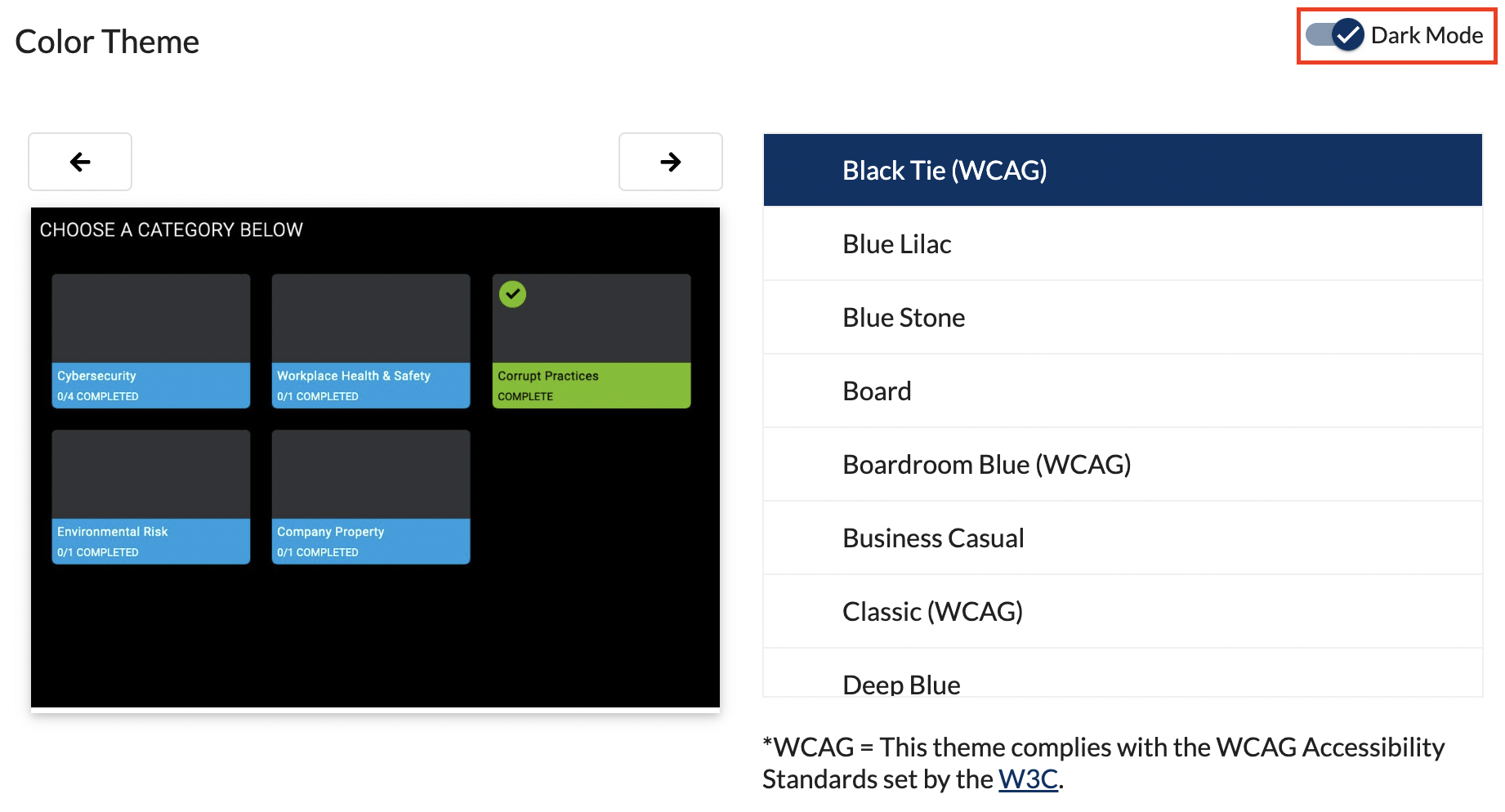Dark Mode can be enabled for the color theme by turning on the Dark Mode Toggle