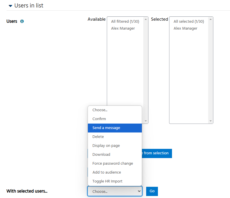 Next, select your users you which to message, moving them to the Selected column. You can move users individually or all at once using the button options shown below.