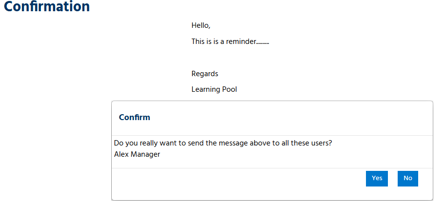 If you are ready to proceed click 'Yes' this will send your message to your selected users. Note, if you are sending a message to a large number of users the screen may take some time to refresh. Please DO NOT continuously hit Yes as this may result in sending the message multiple times.