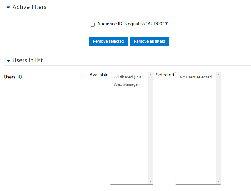 Once the Audience ID has been applied, click on the 'Add Filter' button. You will then see a list of users associated to that audience displayed within the Available column (this example has only 1 user).