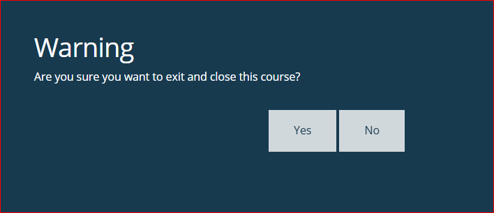 The course exit confirmation extension will provide a message prompt when exiting the course as to confirm you intend to leave the course, as to help avoid the course being closed in error.