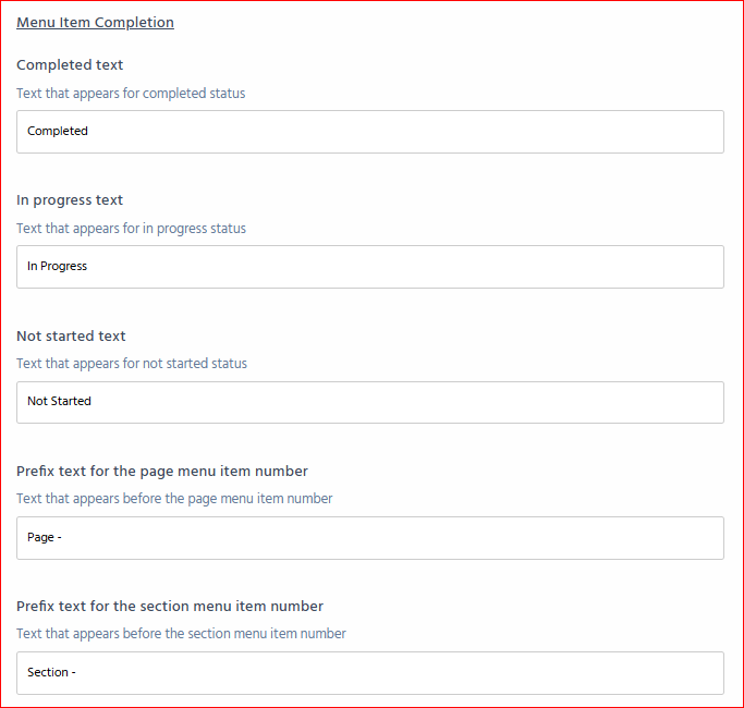 - Prefix Text for the Page menu item number - The text that will be added before the number on the menu item for each of the course pages within the course.