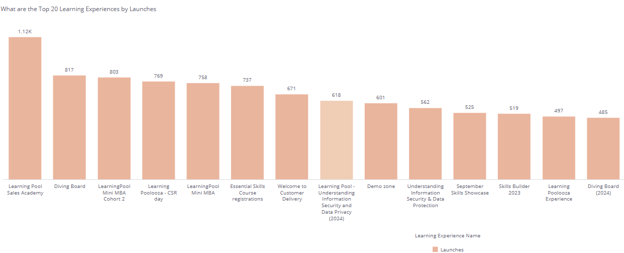 This widget enables you to monitor which learning experiences generate the most initial interest (launches) compared to how many learners actually enrol and complete the training.