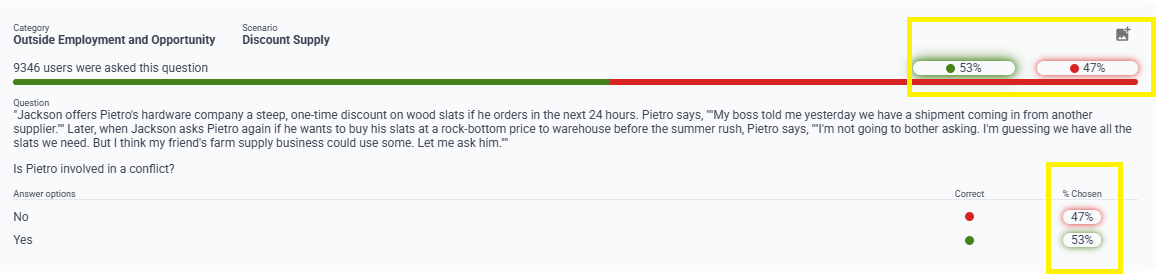 The “Scenario performance” section displays the details for each scenario including category name, the number and percentage of unique users who attempted each question, overall percentage of activity performance, as well as the percentage breakdown of each answer choice.