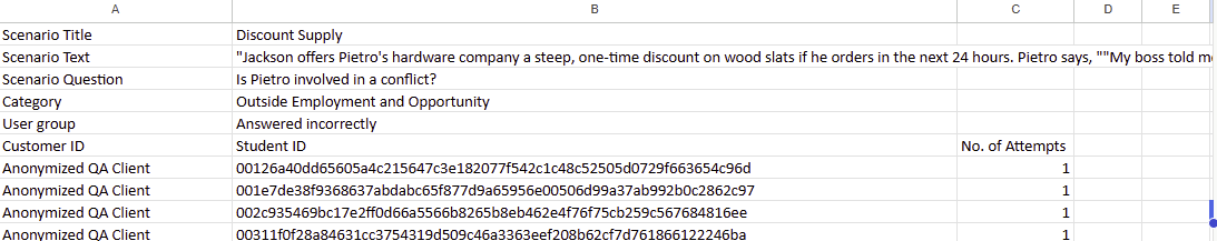 This feature allows you to look further into the scenario performance and time distribution ranges at the learner level, as a downloadable .XLSX file which shows all learners from the selected group.