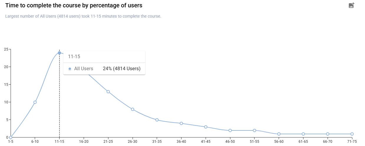 It includes the “Time to complete the course by percentage of users” chart, which shows the distribution of users’ course completion time in five-minute bands (by percentage).