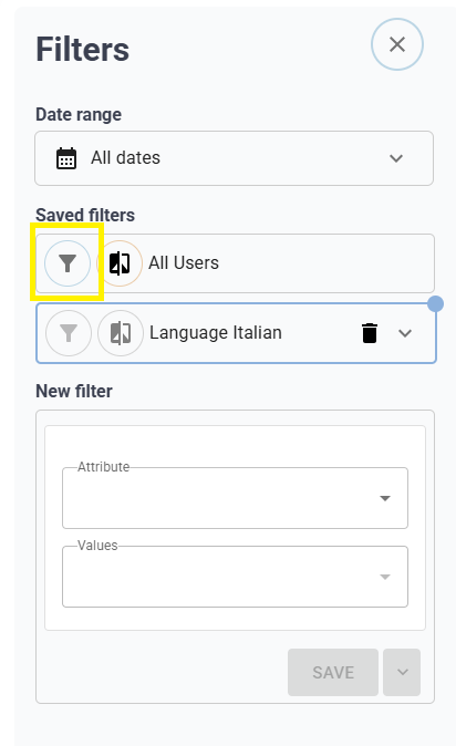 Once a filter is added, it will be selected by default when you click the filter icon on the left-hand side (highlighted in yellow). The selected filter will be outlined in blue, and a circle icon will appear on its right-hand side, indicating its active status.