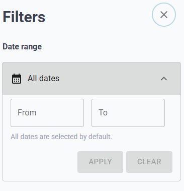 Date ranges can also be applied as a filter. Select the drop down icon ‘From’ and ‘To’ dates and click apply. Please note, if you do not add a filter, all dates are selected by default.