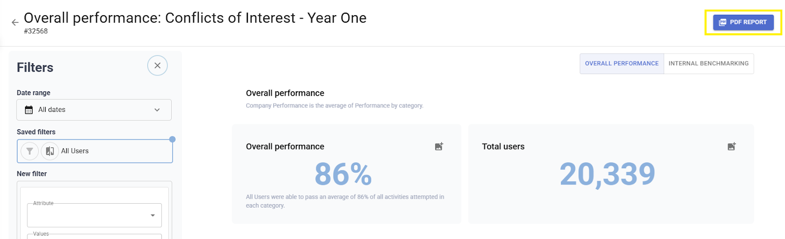 - Once the dashboard loads, locate the “PDF Report” button in the top right corner.