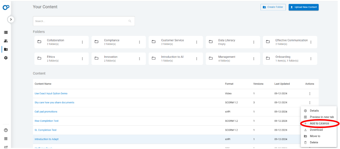 After a licence is created it can be assigned to content by selecting the Add to Licence option from the ellipsis in the Action column on the Your Content page against the content you want to add the licence to.