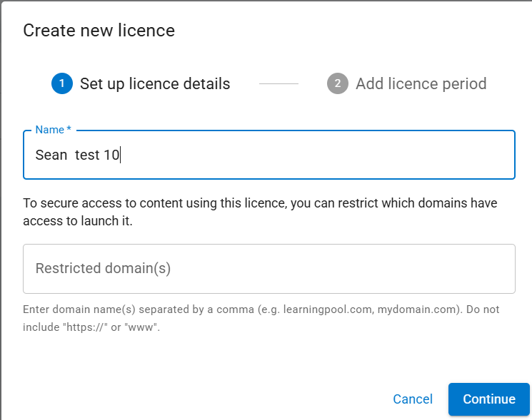 - Access to content can be restricted by license. Specify the domain(s) permitted to access the content. Domains not included in the list will be denied access. Select "Continue" to proceed.
