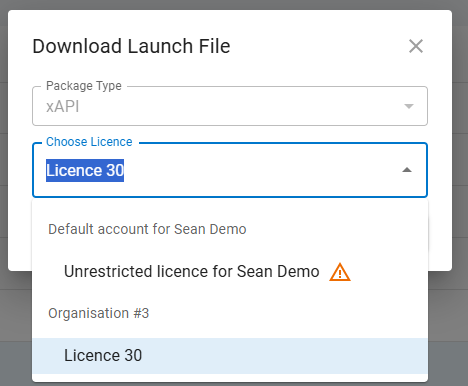 - In the dialog box, select the package type you want to download and choose the licence to attach to the content.