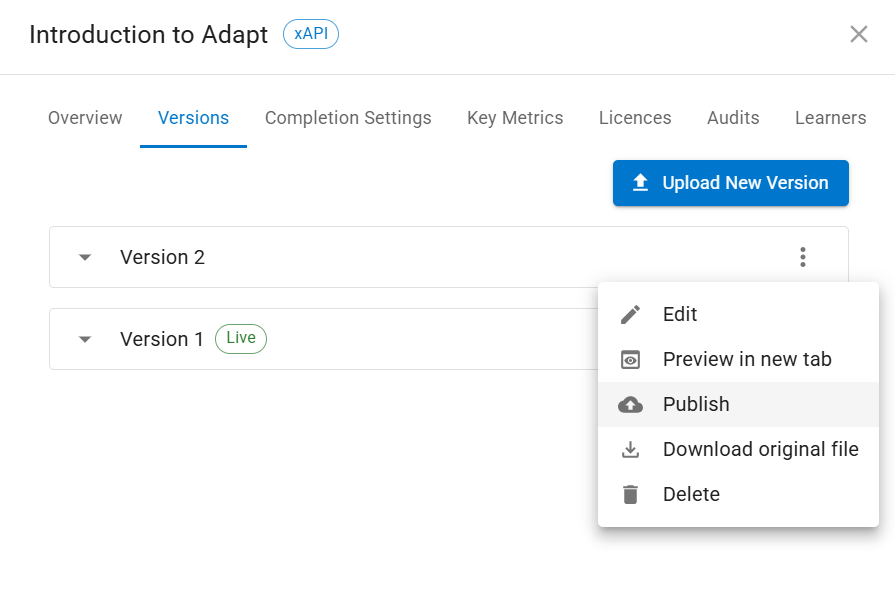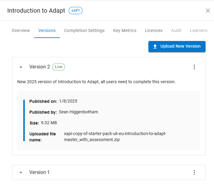 - After the user makes a selection they are returned to the Versions tab where Version 2 is now Live. The launch file on the learning platforms will now open Version 2.