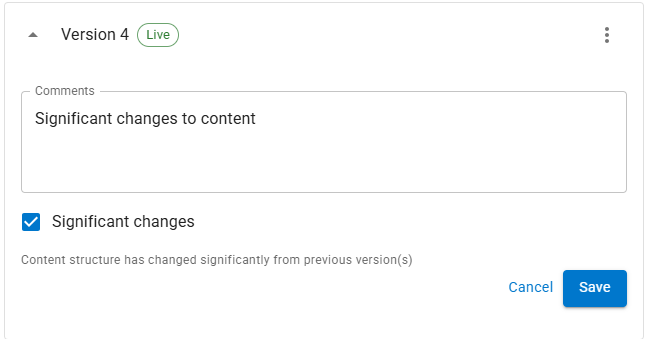 If there is a significant change we have added an option to make this visible in the application. When a new version is added and the user selects the edit option they can select a ‘Significant changes' checkbox, see image below