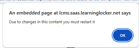 If option 3 is selected ‘Restart all learners on this new version’ they will see this message when they launch the content