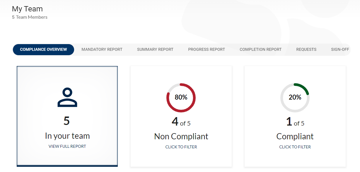 When enabled, the My Team landing page displays a compliance overview with three tiles. Each tile can be clicked to filter the Compliance Overview report.