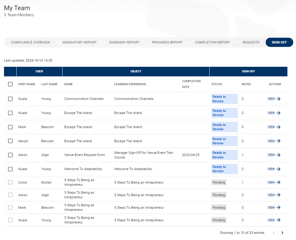 Summary: View your team's completions and sign-off their work from the My Team page.