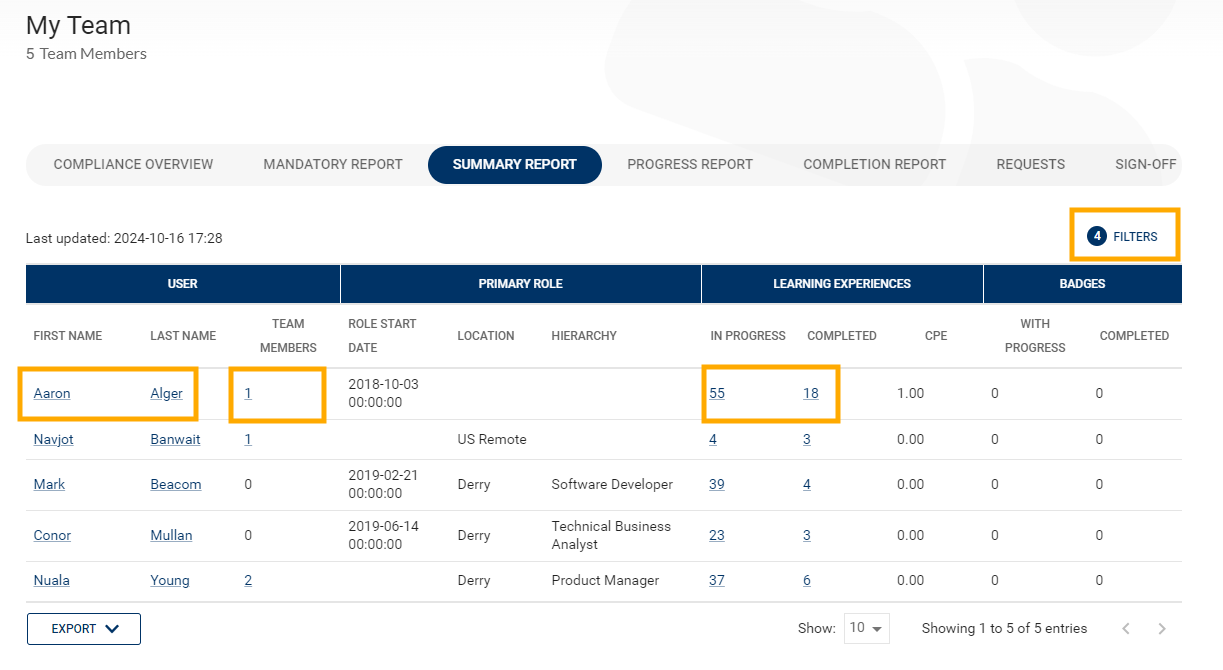 The summary report will display a list of all your team members along with stats about how they’re progressing through the content in the LXP.