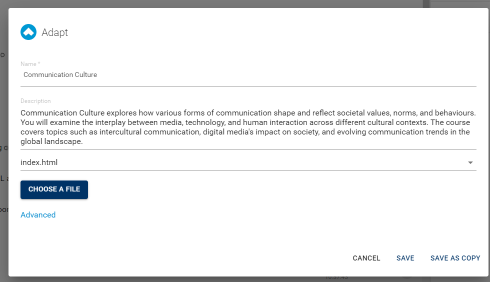 | Adapt is used for eLearning content made in the Adapt Builder (Adapt). You can use this resource type to upload the zip files that you download from Adapt. Click here to learn more about publishing a course in Adapt. |